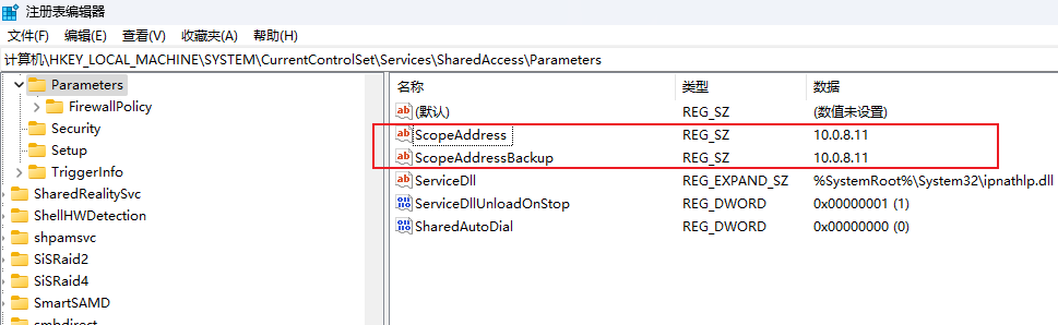 默认情况下,启用Internet共享(NAT)时,Windows会将适配器的IP地址更改为其他地址(以避免冲突),默认为192.168.137.1。但是本次使用共享网卡的wg0为固定IP10.0.8.11。因此需要修改注册表,修改IP地址。