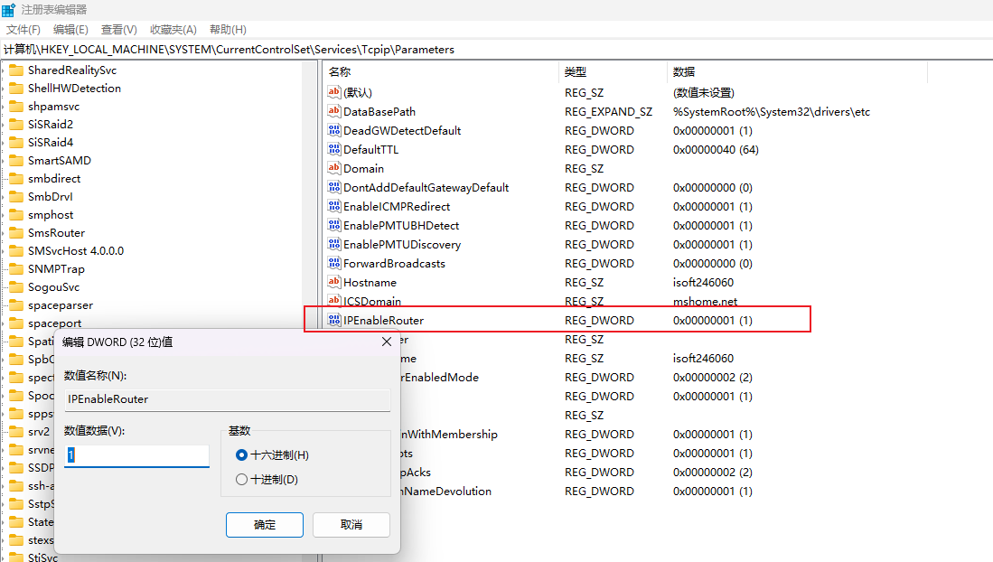 将IPEnableRouter的值修改为1,然后重启电脑。